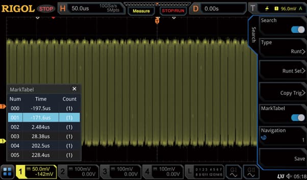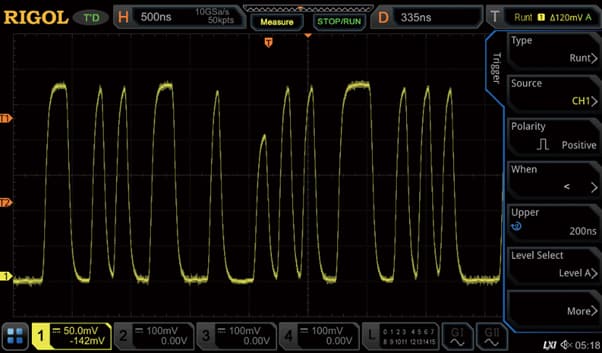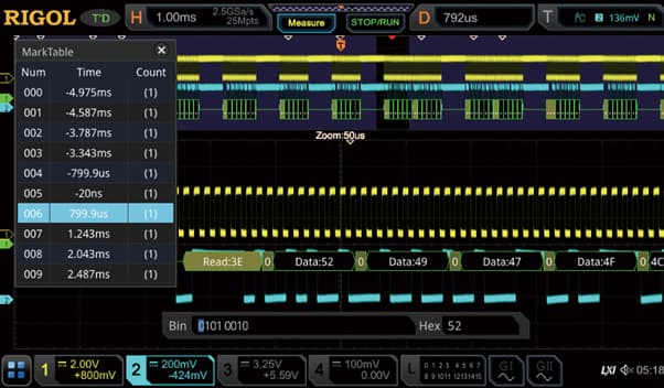Осциллограф предоставляет 13 стандартных типов триггера, включая зонный триггер, позволяющий вручную выделить область сигнала для захвата. Поддержка триггеризации по протоколам коммуникации упрощает выявление ошибок в обмене данными между устройствами.