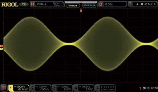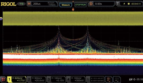 Частота захвата 500 000 осц/с позволяет с высокой вероятностью фиксировать редкие переходные процессы и помехи в сигналах. Встроенная система отображает частоту возникновения событий разными цветами и оттенками, что облегчает визуальное определение характера сигналов.